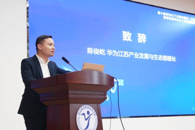 紧接着,华为江苏产业发展与生态部部长陈俊屹致辞。他肯定了南京机电职业技术学院在ICT人才培养方面的成效,强调华为将持续发挥技术与生态优势,深化与学校的合作,为职业教育注入动力,助力青年学子实现职业成长。