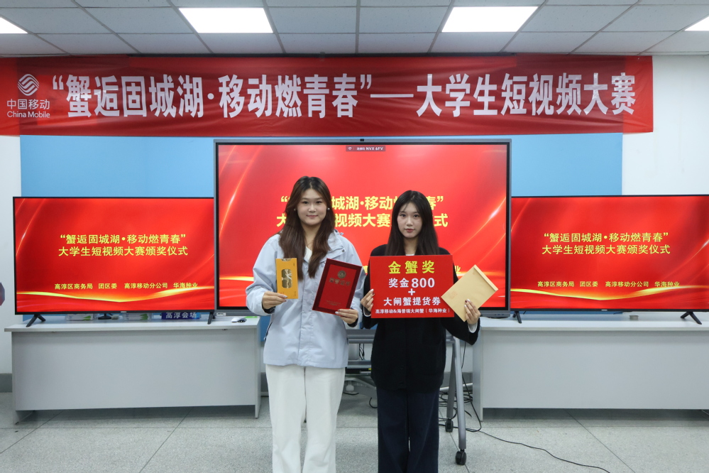 我校翟羽璐、沈孜涵两位同学在比赛中展现了扎实的专业功底和创新能力。其获奖作品以独特的视角、精良的制作,生动展现了固城湖螃蟹的品牌特色与文化内涵,获得评委一致好评。