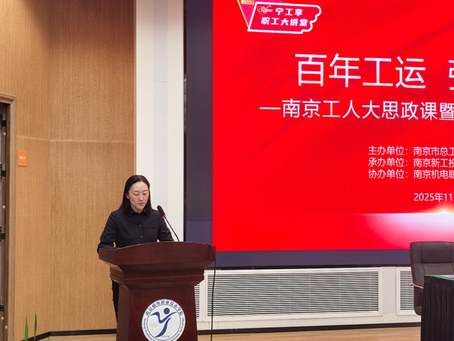 2025年11月27日,由南京市总工会主办、南京新工投资集团工会承办、南京机电职业技术学院工会协办的“百年工运 强会创先”南京工人大思政课暨劳模工匠巡讲活动在南京机电职业技术学院乐学楼102举行。南京新工投资集团工会副主席王春霞、南京机电职业技术学院工会主席姜振宇、机械工程系师生共同参与了本次活动。