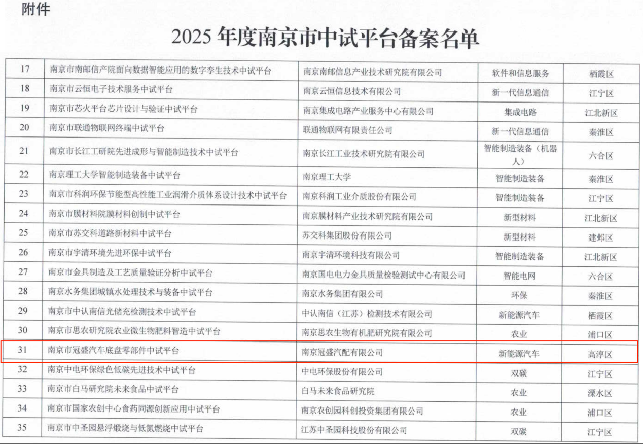 近日,南京市科学技术局公布了2025年度南京市中试平台备案名单,由学校与南京冠盛汽配有限公司联合共建的“南京市冠盛汽车底盘零部件中试平台”成功入选。这标志着校企双方在深化产教融合、共促科技成果转化方面取得了重要阶段性成果,也为区域汽车零部件产业创新发展注入了新动能。