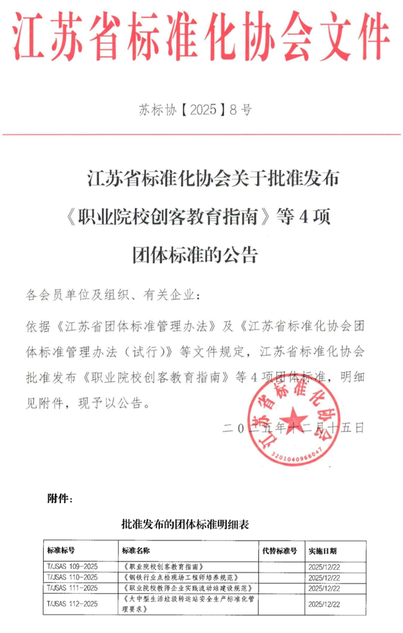 近日,江苏省标准化协会发布《关于批准发布<职业院校创客教育指南>等4项团体标准的公告》。由我校作为第一发起单位牵头研制《职业院校创客教育指南》《钢铁行业点检现场工程师培养规范》《职业院校教师企业实践流动站建设规范》三项产教融合团体标准正式发布,标志学校在产教融合与标准化建设方面取得重要突破。三项团体标准聚焦创新创业教育、现场工程师培养与职业院校教师实践能力提升等关键领域,系统总结学校在产教融合方面的成熟经验,形成可复制、可推广的规范化指引,将为全省乃至全国相关领域的发展提供重要参考依据。