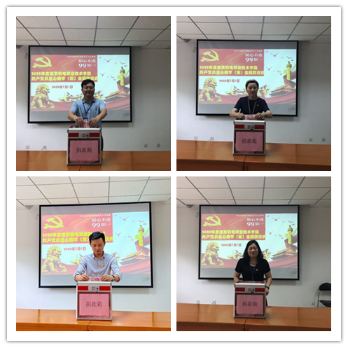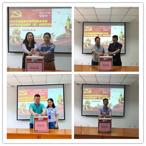在中国共产党成立99周年之际,学院党委在弘德楼107会议室举行“南京机电职业技术学院共产党员爱心助学(困)金捐款仪式”。党委工作部主任周启国、各系部书记及支委委员参加了捐款仪式。