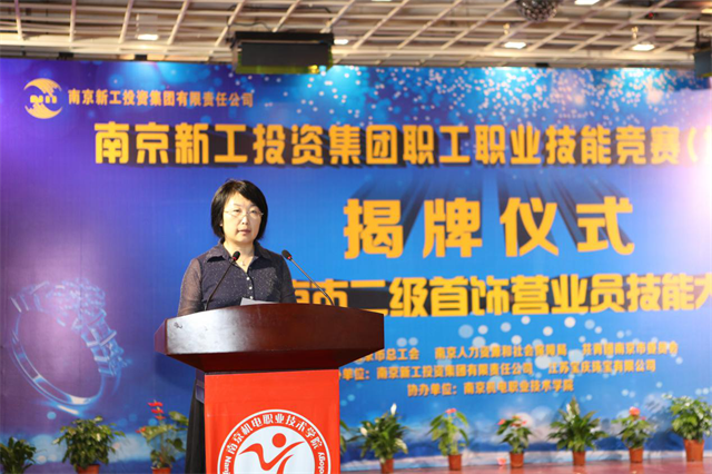 7月28日上午,南京新工投资集团职工职业技能竞赛(培训)基地揭牌仪式暨南京市二级首饰营业员技能大赛在学院中央门校区报告厅举行。市总工会党组成员、副主席陈慧男,新工投资集团党委副书记、工会主席吴启宁,新工投资集团党委委员、总经济师洪薇,学院党委书记、院长周庆礼,学院党委委员、副院长孔德丽,学院党委委员、工会主席姜振宇及市总工会、新工投资集团有限公司相关领导,新工集团各直属企业工会主席及负责培训工作领导出席本次活动。