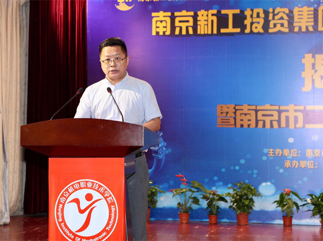 接着,学院党委书记、院长周庆礼致辞。他指出,南京新工投资集团职工职业技能竞赛(培训)基地的命名是推动集团企业高质量发展的重要举措,既是集团领导和各企业对学院的信任,也是责任。今后,学院将根据集团和各企业的实际需要,广泛开展需求调研分析,在充分发挥学院现有教育教学资源优势的基础上,选派精干师资,为各企业量身制定培训方案和培训课程,实行“教、学、做”一体化的培训模式,培养用得上、用得好的技术技能人才。同时,在集团各部门和各企业领导的支持指导下,学院将定期举办多形式、多类型的职工技能竞赛,“以赛促教、以赛促学,以赛促改、以赛促建”,力求赛出影响,赛出品牌,高水平打造集团工匠人才培养的新机制。