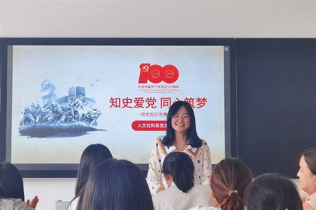 为深入学习贯彻习近平总书记在党史学习教育动员大会上的重要讲话精神,持续深入推动党史学习教育,庆祝中国共产党成立100周年,527日下午,人文社科系党支部在博学楼304举办了主题为“知史爱党,同心筑梦”的党史知识竞答大赛。本次活动由人文社科系党支部副书记叶绘主持,人文社科系全体教师参加。