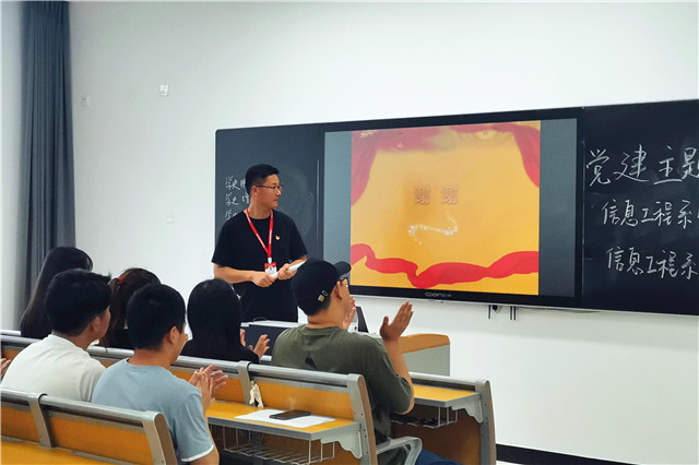 其次,信息工程系团总支书记于宇围绕《重温中国共产党党史》进行主题发言,从学习中共党史的重要意义、内容和方法,带领学生重温党的光辉历史,号召广大青年深入学习党史,全面贯彻习近平总书记对青年学生的要求,重实践、勇担当、讲奉献,在日常生活中展现青年活力、青年担当,努力成长为能够担当民族复兴大任的时代新人。
