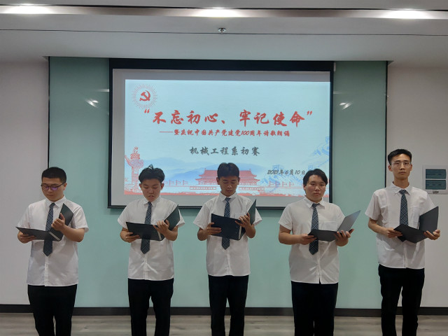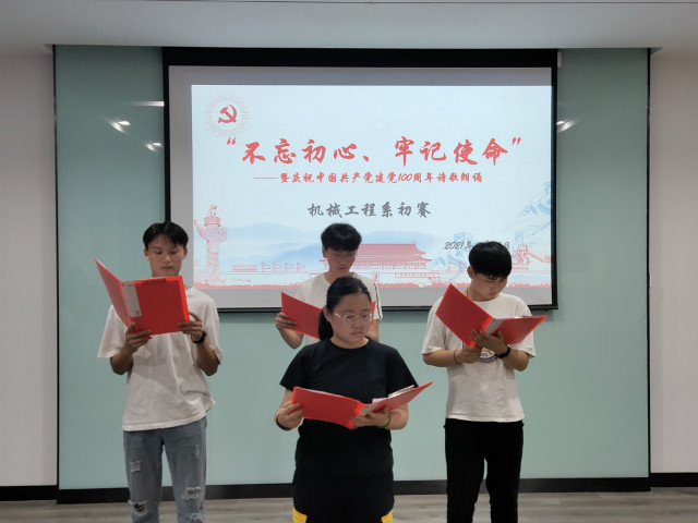 机械工程系团总支在系部党支部领导下,开展了以“‘不忘初心、牢记使命’—— 暨庆祝中国共产党建党100周年”为主题的诗朗诵比赛。参加本次比赛的队伍共计14支,邀请了资助中心主任孙晓燕、机械工程系教师邵加丽、团总支书记沈婷婷担任大赛评委,秘书部部长庄恒担任主持。