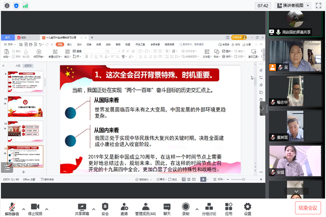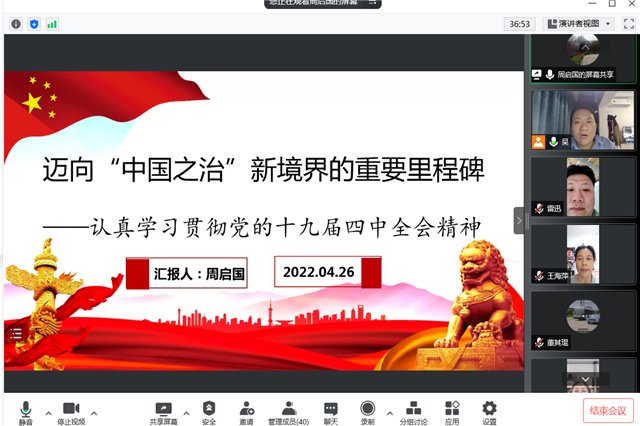 4月26日,电子工程系党支部通过腾讯会议召开了主题为“迈向‘中国之治’新境界的重要里程碑——认真学习贯彻党的十九届四中全会精神”的专题学习会。本次学习会邀请了学校党委工作部部长周启国主讲支部书记吴伟萍及系部全体教职工参加了此次学习。