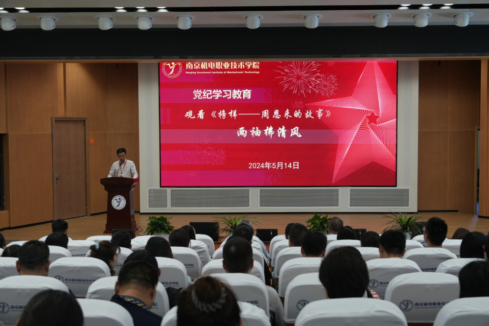 为扎实有序推进党纪学习教育走深走实,进一步引导全体党员坚定理想信念、筑牢政治忠诚、永葆清正廉洁,将党纪学习教育融入日常、抓在经常,5月14日,南京机电职业技术学院组织全体党员观看教育纪录片《榜样——周恩来的故事》。学校全体党员参加,会议由党委工作部副部长高水冕主持。