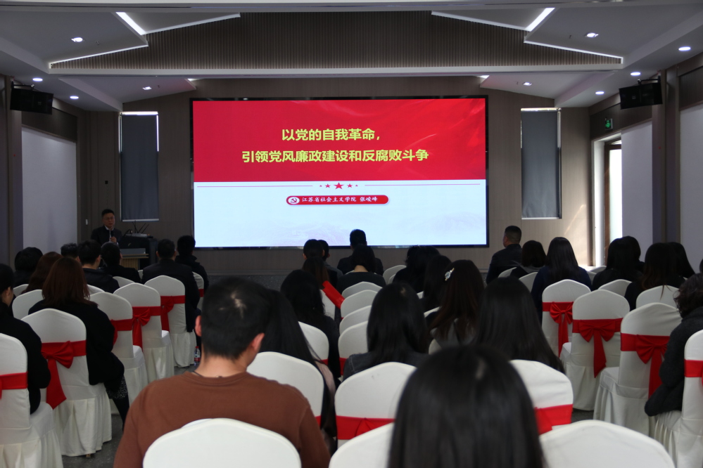 最后,江苏省社会主义学院张峻峰处长带来了一场“以党的自我革命,引领党风廉政建设和反腐败斗争”为主题的党课。张处长从党风廉政建设和反腐败斗争的新形势新使命新任务、党风廉政建设和反腐败斗争的总要求总方针总开关、纵深推进新时代新征程党风廉政建设和反腐败斗争三个方面,阐述了全面从严治党的重要性、紧迫性和必要性。课堂上,党员们全神贯注,认真记录要点,积极与张处长互动交流。大家深刻认识到,党风廉政建设和反腐败斗争关系到党的生死存亡,每一位党员都肩负着重要责任。