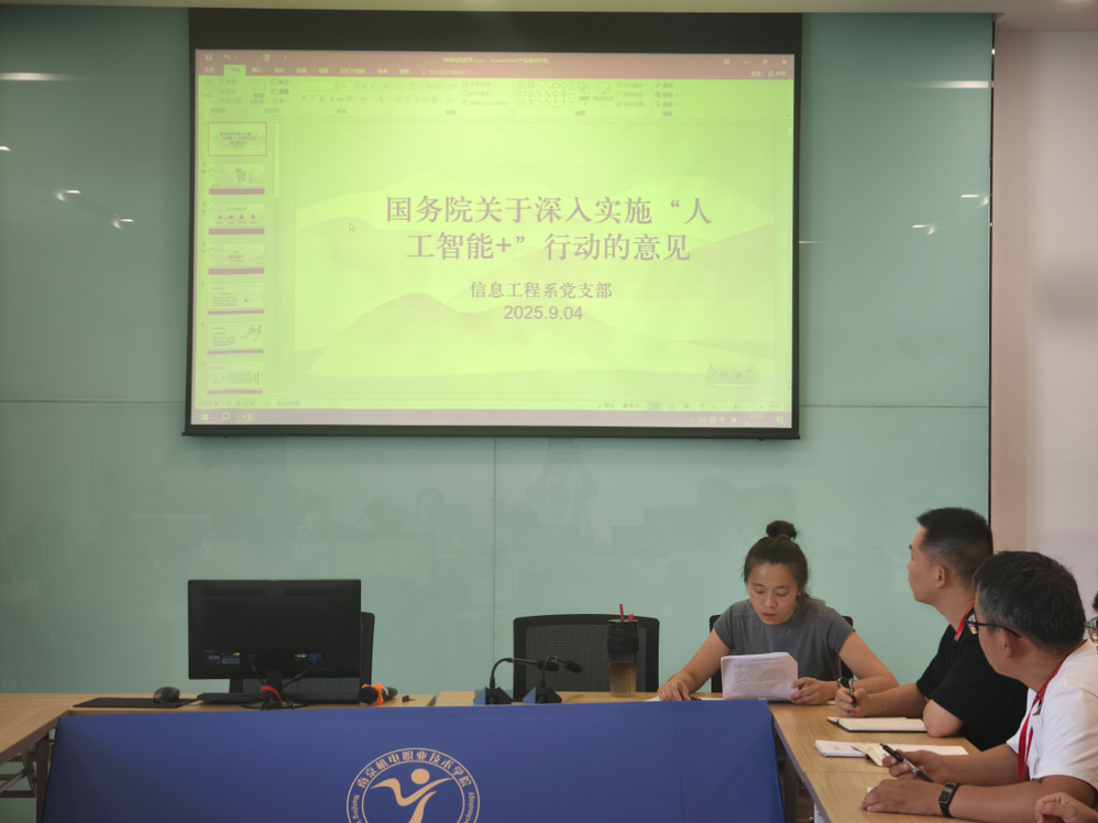 9月4日下午,信息工程系党支部在弘毅楼602开展了党员政治理论学习活动,此次学习聚焦于《国务院关于深入实施“人工智能+” 行动的意见》,由系教学副主任刘娴担任主讲人。