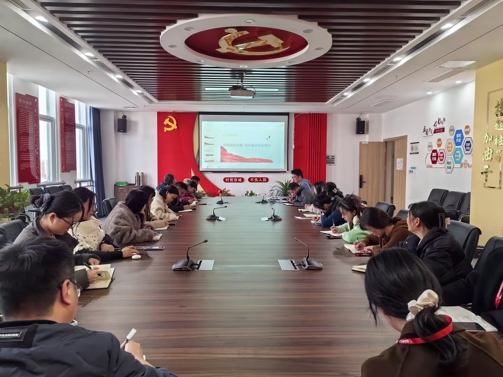 本次学习紧扣2025年党支部政治学习计划,设置三大核心内容。在“第一议题”学习环节,全体教职工集中学习了习近平总书记关于全面依法治国的重要指示精神,深刻领会“坚持党的领导、人民当家作主、依法治国有机统一”的核心要义,明确了新时代全面依法治国的战略部署与实践要求,进一步增强了依法履职、依规办事的思想自觉和行动自觉。
