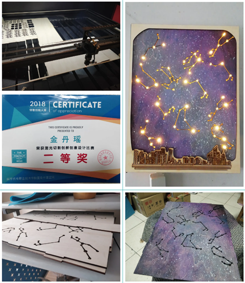 激发我兴趣的是第一节激光切割体验课,老师指导我们如何利用软件制作一个简单的名片和二维码的图,并去工坊打印出来。恰逢学院举办激光切割大赛,我构思了一个项目并且报名参加。一开始,我就遇到了一个大难题,由于专业原因,我没有系统的学习过CAD画图,于是便开始在网上自学,去请教老师和机械系的同学。经过不断的构思、修改,确定了最后的图纸。实践是检验真理的唯一标准,在不断的去工坊切割、失败、修改图纸之后,最后终于得到了我想象中的星空灯,将想象变为现实,在比赛中获得了二等奖的好成绩。