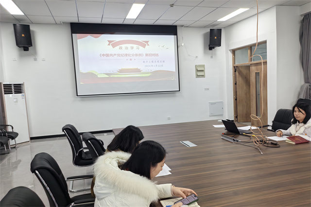 为牢固树立党员干部纪律意识,进一步深化纪律建设,以铁的纪律护航南京机电职业技术学院高质量发展,2024年1月12日,电子工程系党支部组织专题学习2024年1月1日起实施的《中国共产党纪律处分条例》。本次学习由系党支部副书记陈雪主持,系部全体人员参加。