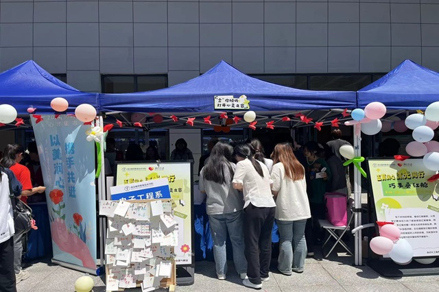 5月28日下午,电子工程系在学校鲁班广场开展“盒”你倾诉,打开心灵之窗——5.25心理集市活动,系党支部副书记陈雪、系部心理老师禹花宁以及系心理气象站全体成员参加活动。