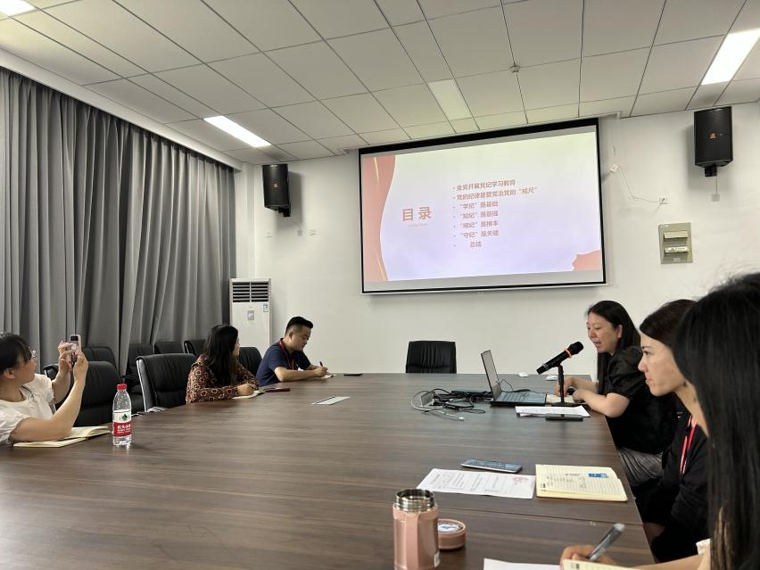 党课上陈雪列举了10则在教育领域中违反廉洁纪律的典型案例,她以案例出发,结合《中国共产党纪律处分条例》中与案例对应的内容给党员们进行剖析,通过列出案例、对照条例、提出问题、总结防范四个角度引导党员、干部学纪、知纪、明纪、守纪,推动党纪学习教育走深走实。