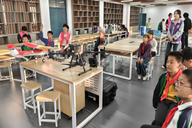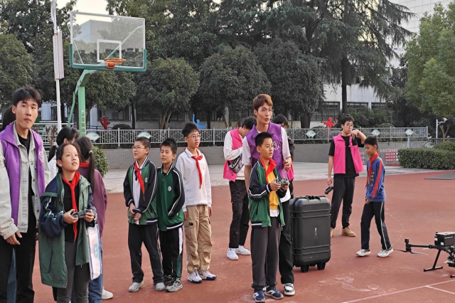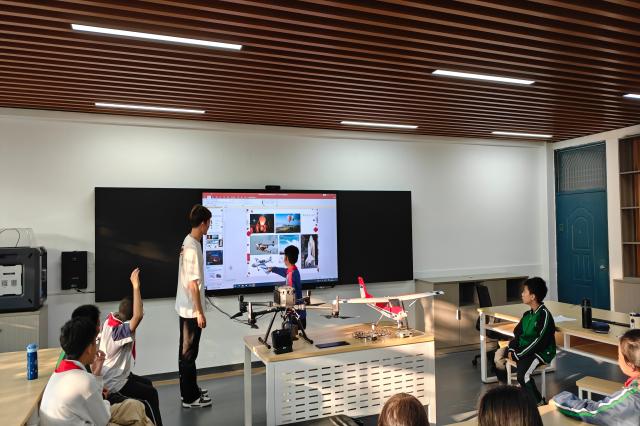 在社团专属活动室中,电子工程系团委副书记柏晋峰作为宣讲人,向同学们依次介绍了无人机的基本原理、主要类型以及其在农业、环保、航拍、物流等领域的广泛应用。在互动问答环节,孩子们纷纷举手抢答,展现出对于无人机知识的浓厚兴趣。身穿紫色小马甲的志愿者们不仅给予了准确的回答,还鼓励学生们发挥想象力,提出更多有创意的问题。这种双向互动不仅加深了学生们对无人机技术的理解,也激发了他们对科学探索的热情。