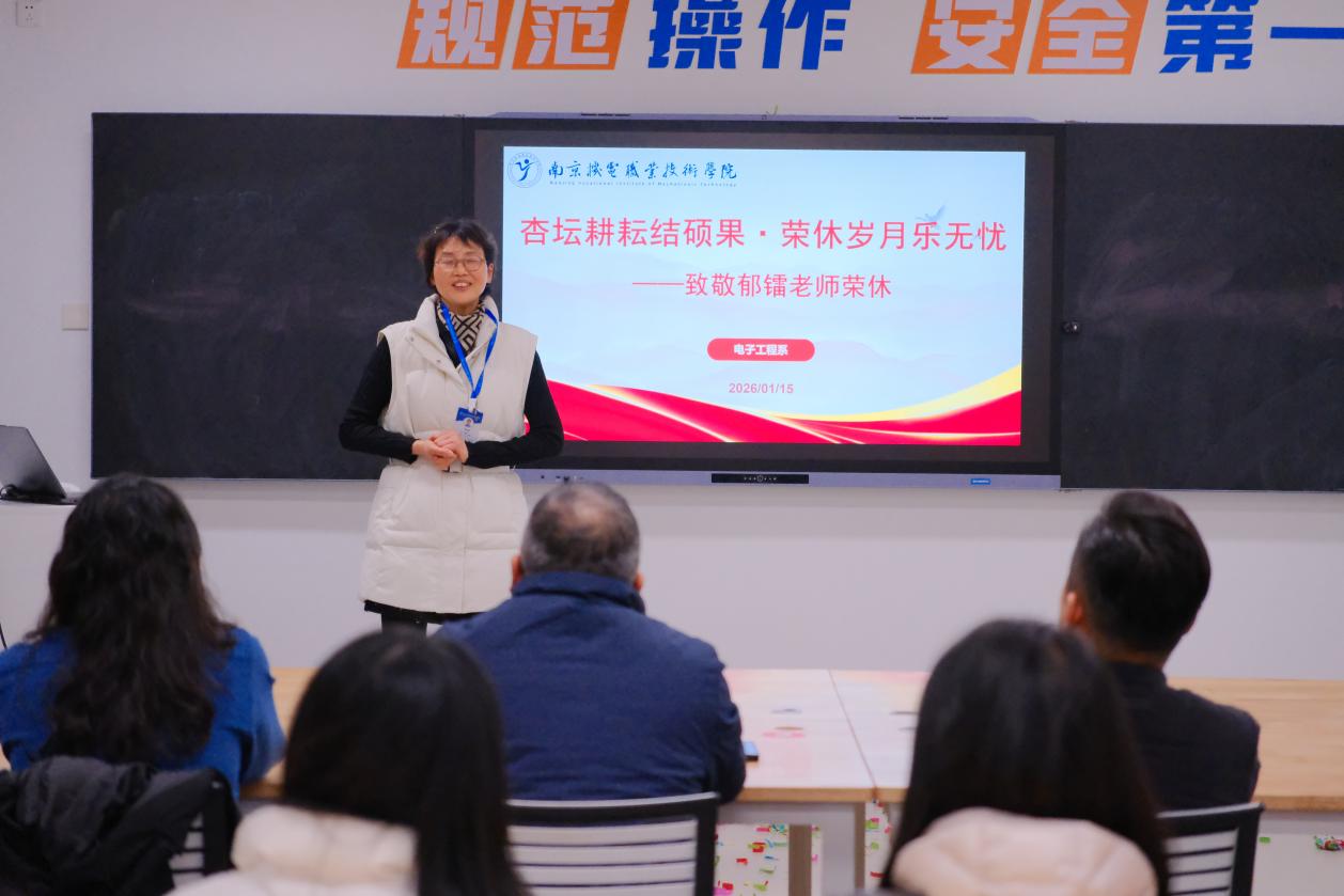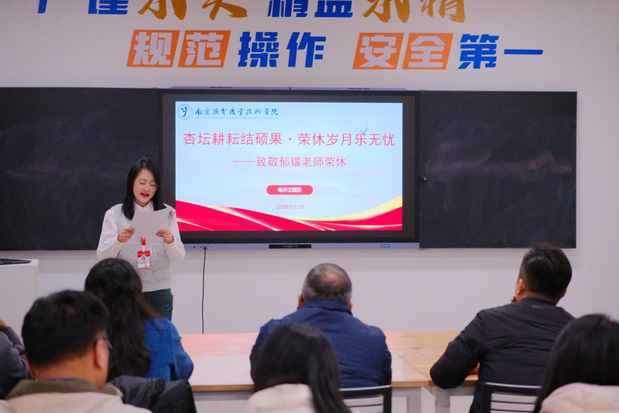 为致敬深耕教育一线的老教师,传承优良师风,践行党支部“暖心”行动理念,2026年1月15日,电子工程系在慎行楼208会议室温暖举办“杏坛耕耘结硕果·荣休岁月乐无忧”郁镭老师荣休欢送会。本次欢送会特邀原电子工程系杨春雷主任、吴伟萍书记,与全系教师齐聚一堂,共同为郁镭老师送上最真挚的祝福,见证这一温馨而庄重的时刻。