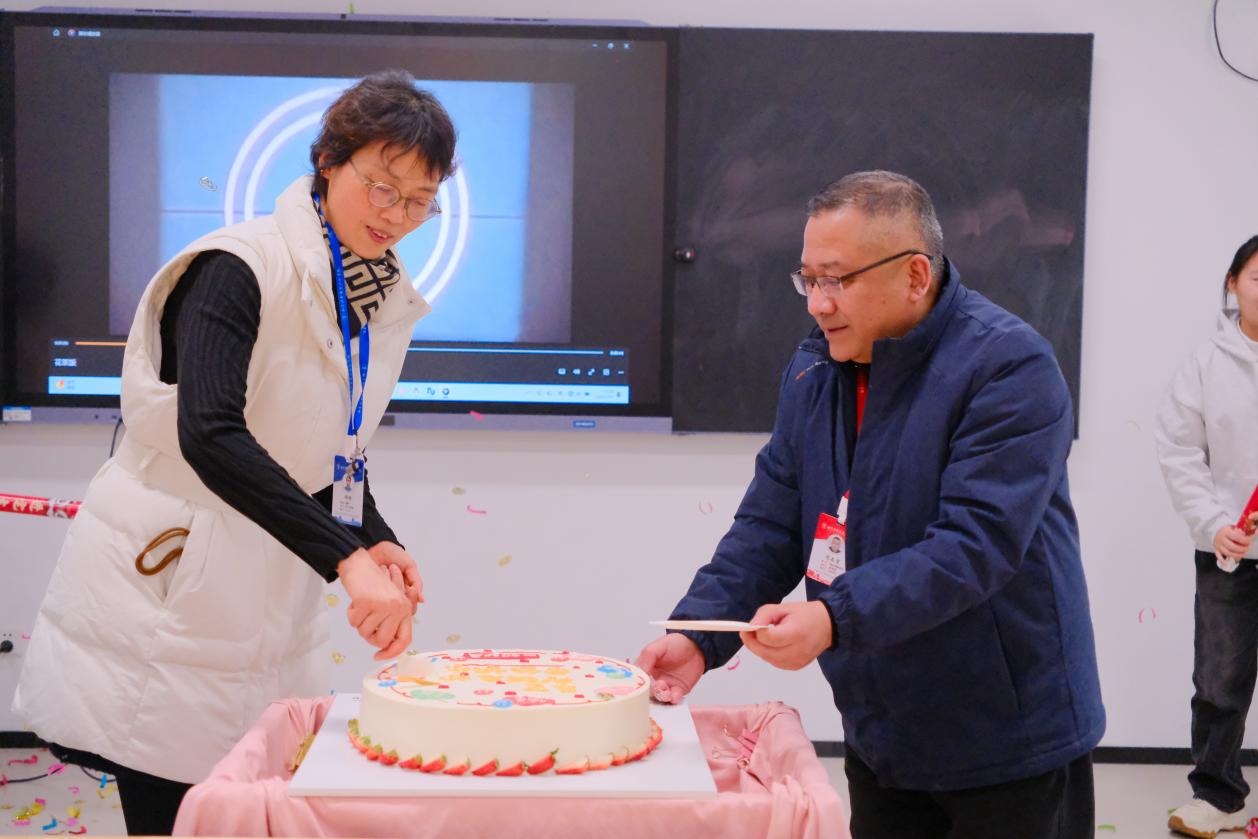 荣休是辉煌岁月的落幕,更是幸福生活的开启。现场,承载着全体师生祝福的“桃李芬芳,荣休安康”主题蛋糕被缓缓推至中央,郁镭老师与杨春雷主任共同切分蛋糕,分享这份甜蜜与喜悦,祝愿郁镭老师退休生活甜甜蜜蜜、福寿绵长。在温馨的背景音乐中,为现场师生分发蛋糕,大家在品尝甜蜜的同时,将最美好的祝福送给郁镭老师。