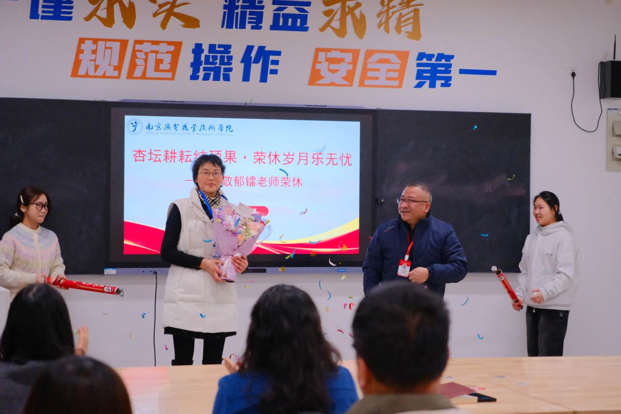 掌声中,郁镭老师上台,杨春雷主任为其献上鲜花,代表学校对郁镭老师数十年的辛勤耕耘与突出贡献致以崇高敬意。伴随着礼炮声响,现场氛围达到第一个高潮,这份荣誉与祝福,是对郁镭老师教育生涯的最好致敬。随后,郁镭老师发表退休感言,言语间满是对教育事业的眷恋、对同事伙伴的不舍以及对学子们的殷切期许,真挚的情感打动了现场每一个人,赢得阵阵掌声。