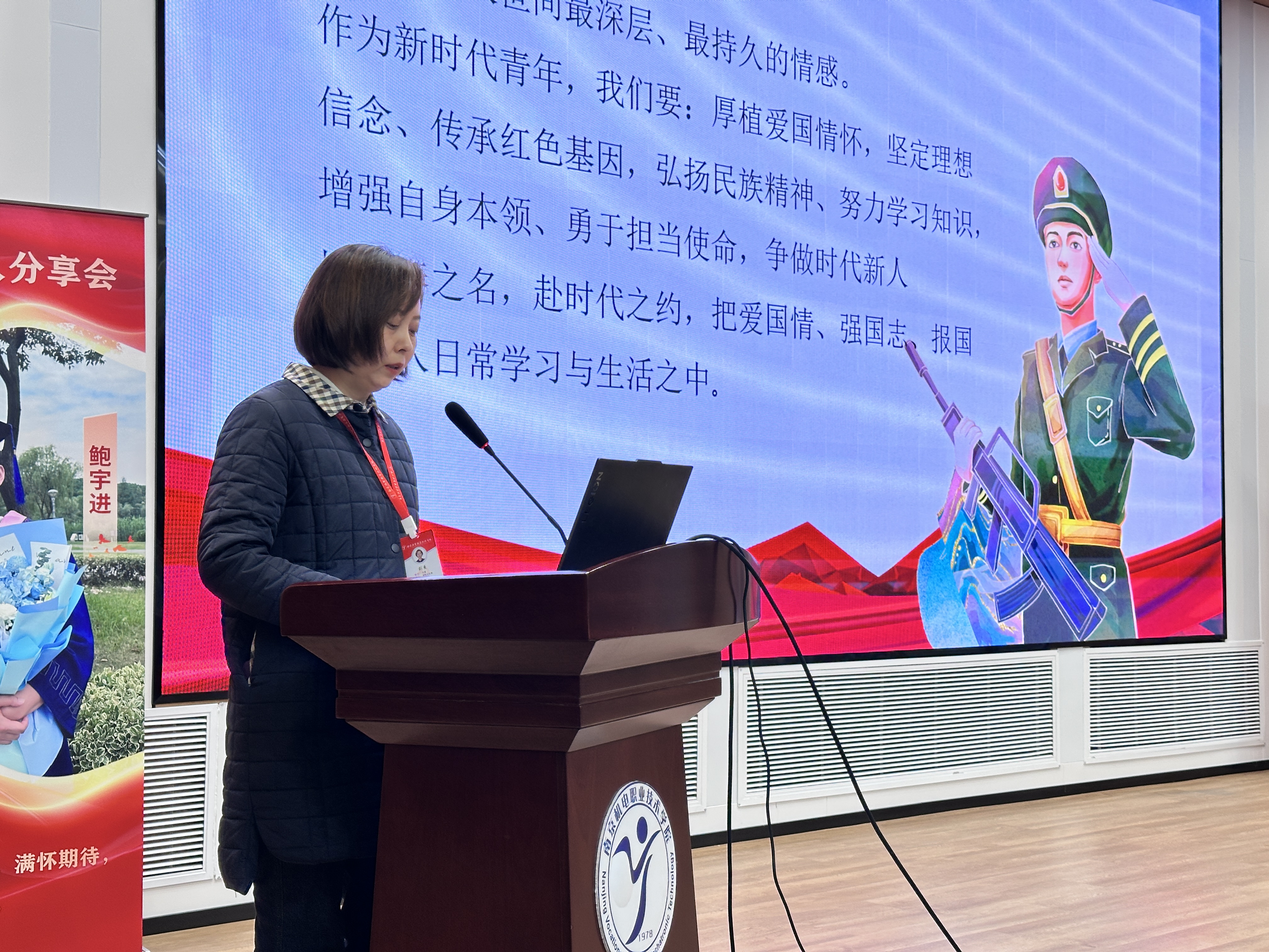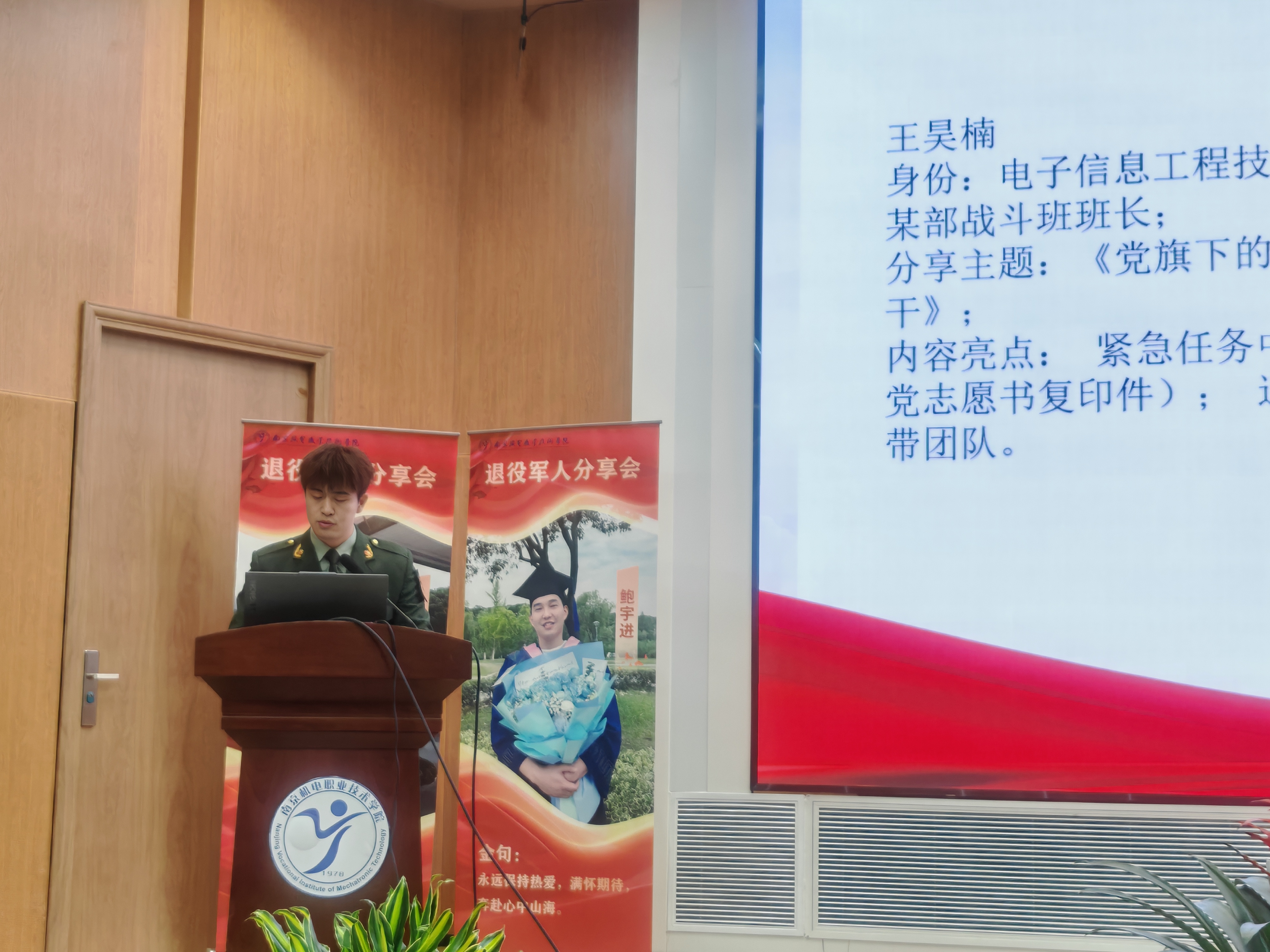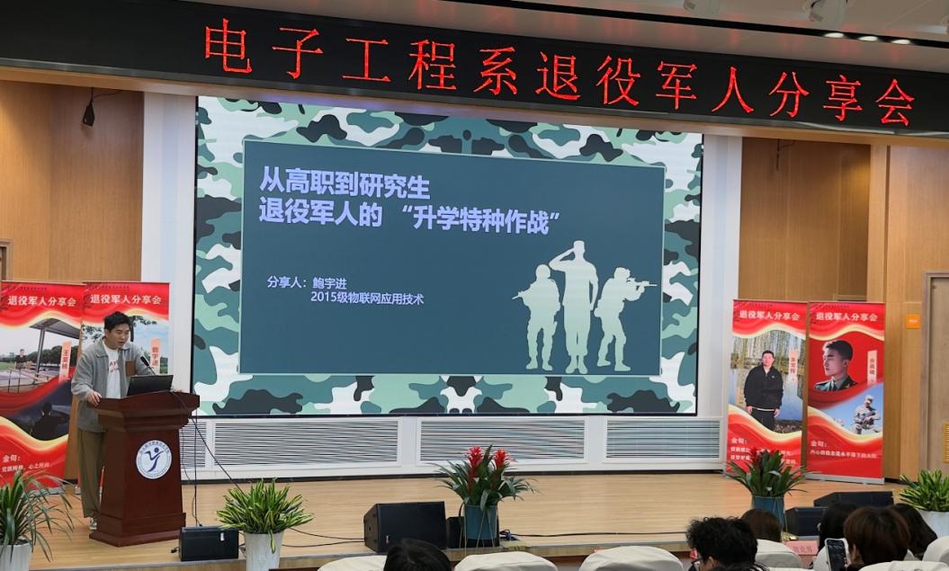 原物联网应用技术151班学生、退役火箭军军人、南京晓庄学院本科毕业生、江苏大学硕士毕业生鲍宇进,以《从高职到硕士:退役军人的“升学特种作战”》为主题,梳理了自己从高职入伍到退役升学,最终考取硕士研究生的完整历程,分享了高效备考、规划学业的实用经验,为有升学需求的同学提供了清晰指引,彰显了退役军人永不言弃的奋斗精神。