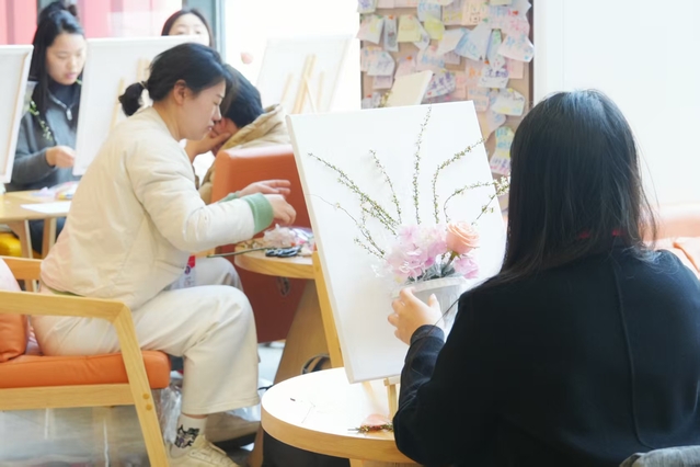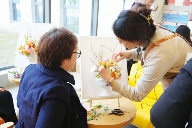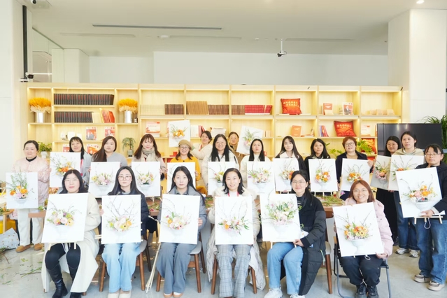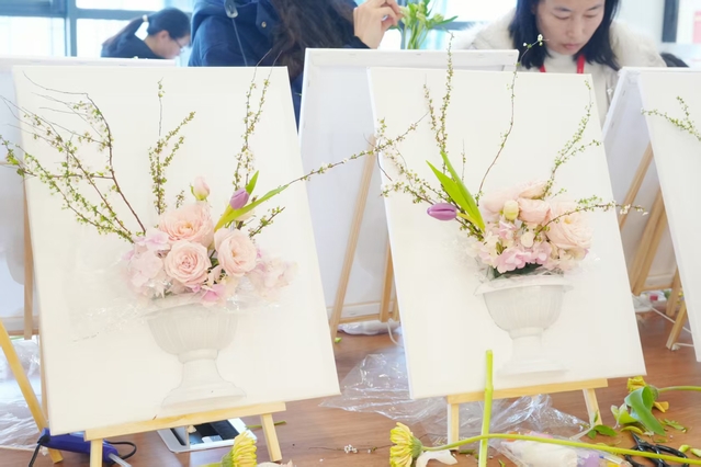 “向内观己,向美而生” 油画插花活动现场温馨雅致,各色鲜花与油画素材相映成趣。活动特邀专业老师授课,将传统花艺与油画艺术创新融合,指导女职工们进行立体插花创作。从花材认知、色彩搭配到构图设计,女职工们认真聆听讲解,在实践中尽情释放创意。大家精心挑选玫瑰、洋桔梗、小雏菊等花材,巧妙搭配油画背景板,修剪枝叶、调整角度,在交流切磋中完成一件件独具匠心的作品。原本零散的花材与画材,在女职工的巧手下化为兼具艺术感与生命力的立体景观,每一件作品都承载着对生活的热爱与对美好的向往。