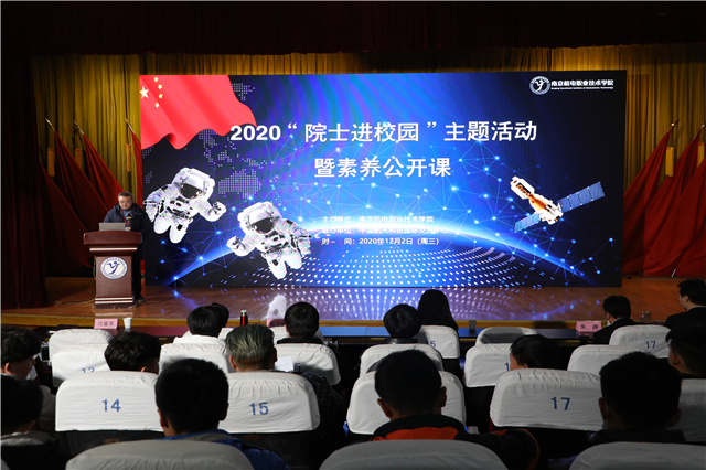 12月2日,“院士进校园”主题活动暨素养公开课在我校报告厅举行,国际宇航科学院院士赵文波女士为我校师生精彩开讲。中国航天科技国际交流中心产教融合处处长朱涛,学校党委副书记、纪委书记、副院长陈赵,党委委员、副院长刁爱军,蓝岛创客空间副主任王国珍出席活动。南京机电职业技术学院教师与学生代表400余人参加活动。活动由副院长刁爱军主持。