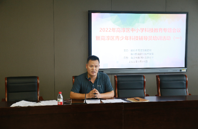 2022年9月15日,为切实提升高淳区中小学校青少年科技辅导员队伍的科学素养和创新能力,我校蓝岛创客空间王国珍、杨阳前往高淳区滨湖小学参加“2022年高淳区中小学科技教育专题会议暨高淳区青少年科技辅导员培训活动”,为现场教师进行创新能力的相关培训。 本次活动由南京市高淳区教育局和南京机电职业技术学院主办,南京市高淳区滨湖小学承办。高淳区教育局基础教育科王云生和高淳区各中小学的青少年科技辅导员均参加了本次活动。
