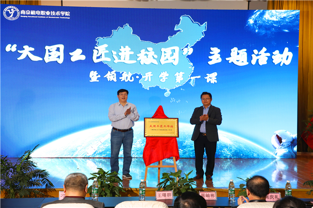 2020年10月27日,“大国工匠进校园”主题活动暨领航·开学第一课在南京机电职业技术学院报告厅举行。本次活动学校副校长刁爱军与大国工匠王曙群先生共同签署了《客座教授意向书》,授予王曙群先生南京机电职业技术学院客座教授聘书。校长周庆礼和王曙群先生一同为南京机电职业技术学院“大国工匠工作站”揭牌,“大国工匠工作站王曙群航天空间机构装配工作室”正式成立。