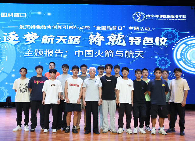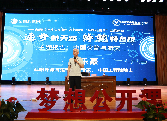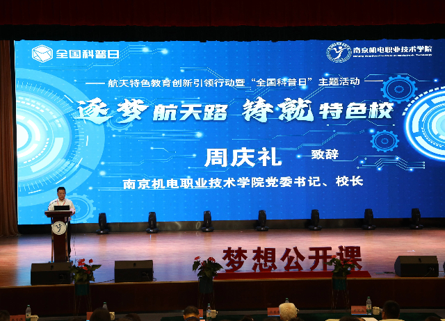 下午的主题报告在我校星梦馆的青春剧场举行。战略导弹与运载火箭专家、中国工程院院士龙乐豪,中国航天科技国际交流中心副主任周岫彬,南京市教育局副局长田家英,南京市高淳区政府副区长邱峰,南京新工投资集团总经济师洪薇,南京市教育局职社处处长黄子亮,南京高职园党工委书记刘宜军,南京机电产业集团党委副书记顾永宁、上海航天专家、高级技师、上海航天技能实训中心主任秦文津,南京高职园党工委副书记、管委会主任孔桂红,南京机电产业集团副总经理沈达和南京机电职业技术学院党委书记、校长周庆礼等领导出席了本次活动。南京机电职业技术学院副校长刁爱军主持会议。