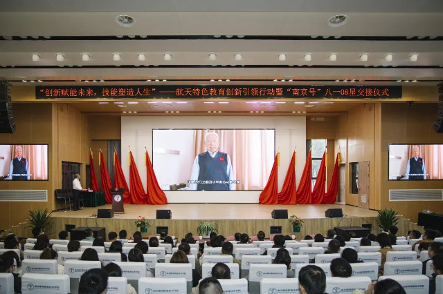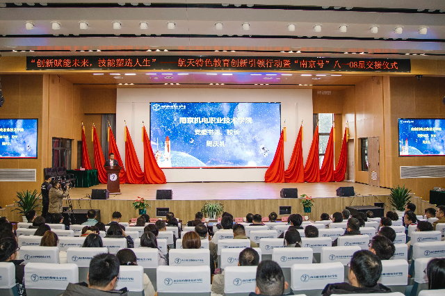 在与会领导们的见证下,航天员赵传东代表相关部门向南机电周庆礼书记正式移交象征着“南京号”八一08星的卫星信物,卫星正式移交至南京机电职业技术学院。