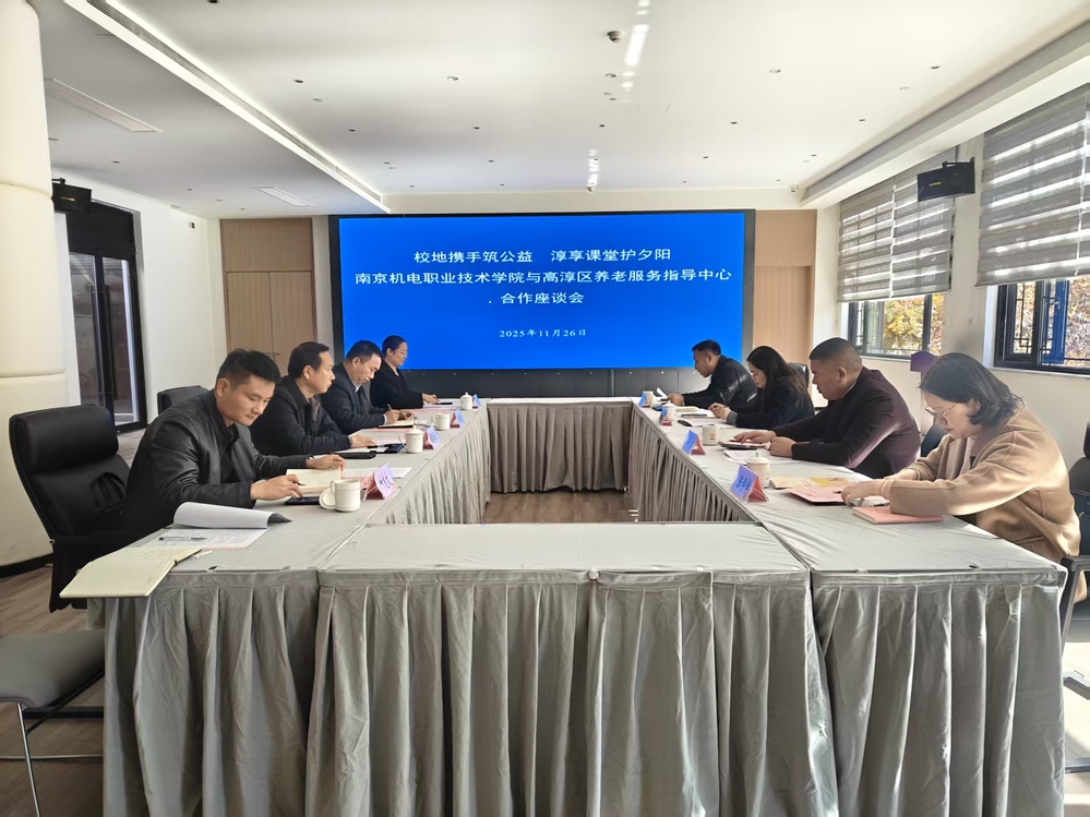 2025年11月26日,南京机电职业技术学院与高淳区养老服务指导中心在区养老服务指导中心培训实操中心召开合作座谈会。双方聚焦“校地携手筑公益 淳享课堂护夕阳”主题,深入探讨推进“淳享养老”公益课堂及养老服务人才联合培养,共谋养老服务高质量发展。