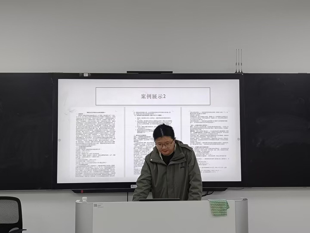 教研会上,吴卓然老师首先进行了主题分享。她结合大数据与会计专业的教学特点,系统介绍了利用AI工具辅助生成与优化课程教学案例的基本思路、适用平台及具体方法。通过现场演示,吴老师展示了如何借助AI快速生成贴合《经济法基础》课程知识点的纠纷情景案例,王诗雅老师也分享了构建《智慧化成本会计核算》中涉及多环节核算的综合性实践案例样本。吴老师强调,合理的提示词设计与清晰的案例要求描述,是获取高质量AI生成内容的关键,AI不仅能提升案例开发的效率,更能引入新颖视角与海量数据背景,使教学案例更具时代性和启发性。