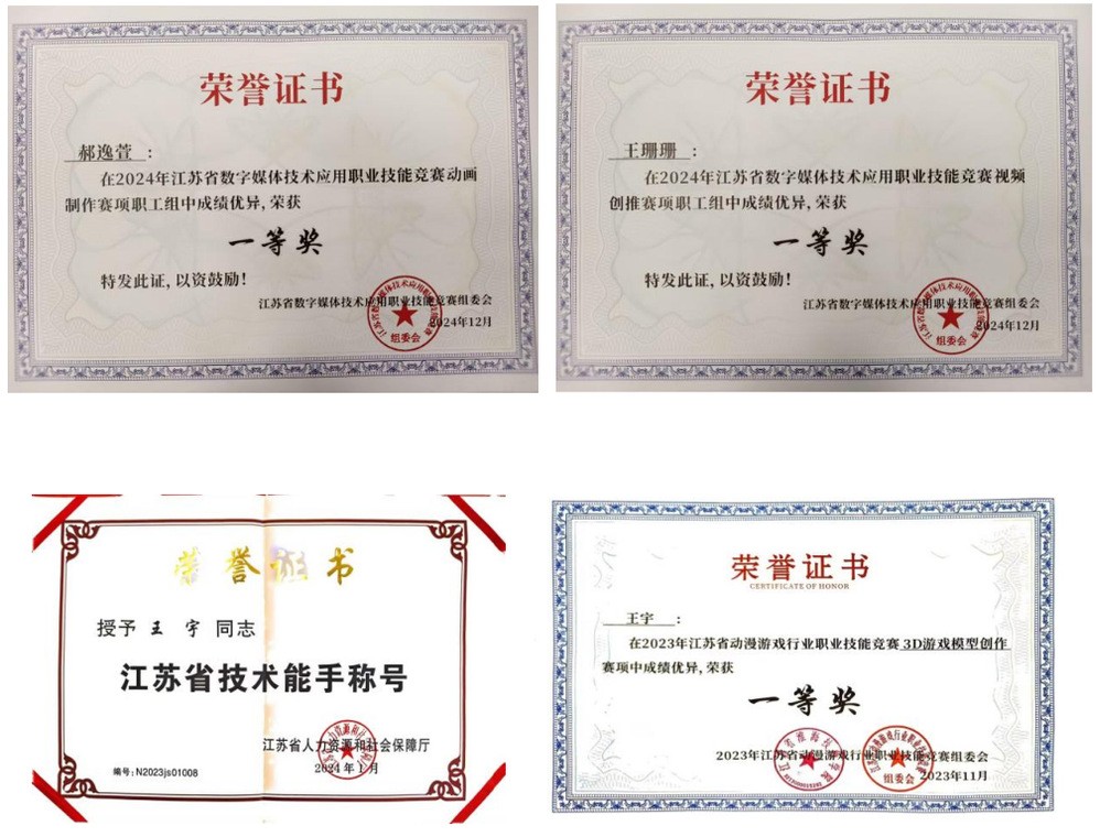 专业坚持“以赛促教、以赛促学”,师生在各级各类竞赛中表现优异。近两年,学生团队在江苏省职业院校技能大赛、“江苏工匠”职业技能竞赛、全国高校数字艺术设计大赛等赛事中荣获一、二、三等奖20余项。教师团队在省级教学能力比赛中荣获二等奖,师生共授权专利10余件,多名教师获得省级以上荣誉。