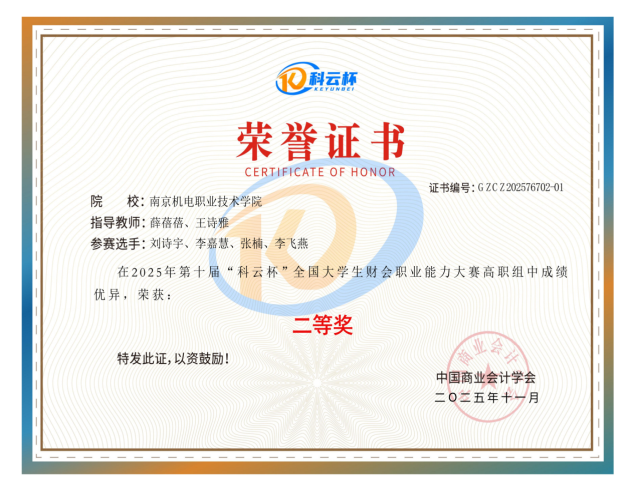 专业精准对接行业需求,引导学生考取初级会计职称、1+X业财一体信息化职业技能等级证书、大数据财务分析师、金蝶数字人才证书等权威证书。同时,以赛促学,组织学生参与“一带一路暨金砖国家技能发展与技术创新大赛”“科云杯”“福斯特杯”等国家级、省级赛事,近年来斩获国赛二等奖、省赛一等奖多项,学子在竞赛中提升专业技能,丰富个人履历,成为企业争抢的优质人才。