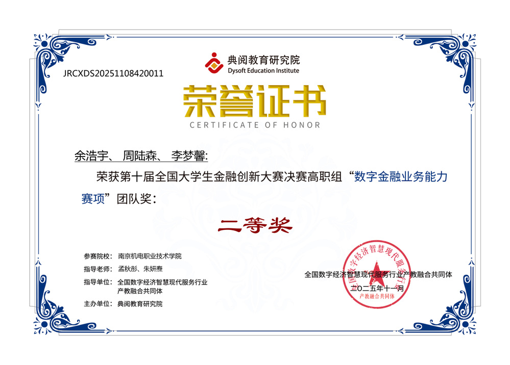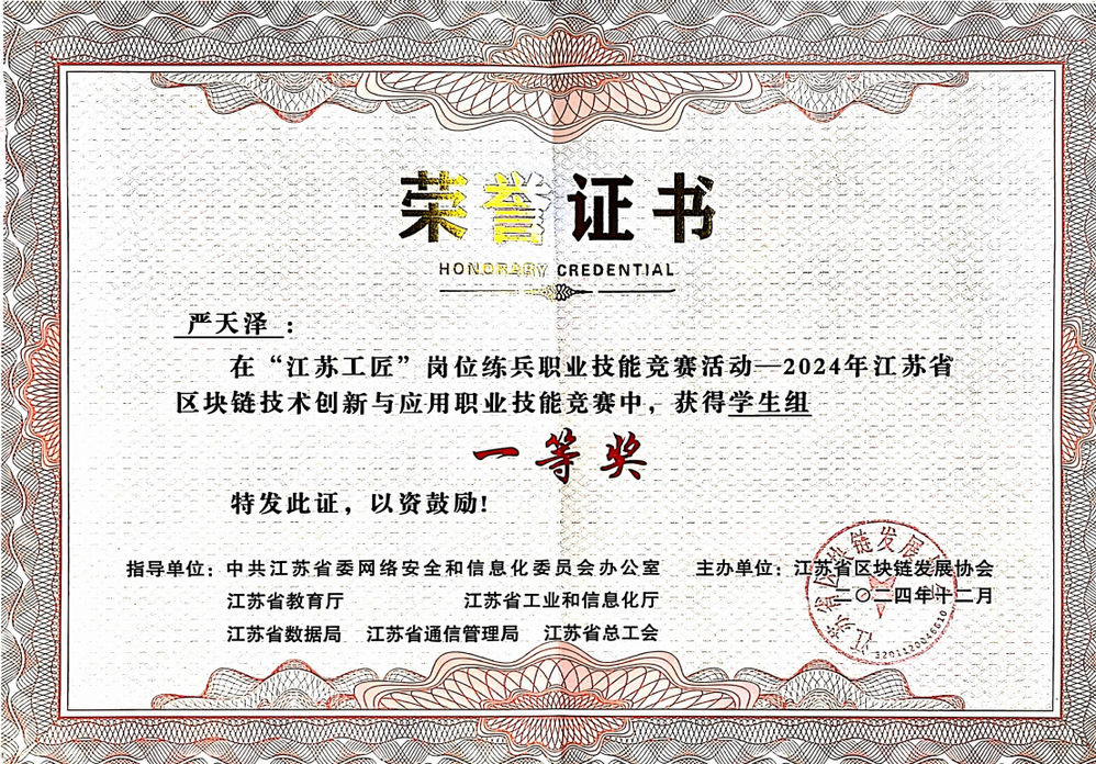 专业坚持“以赛促教、以赛促学、以赛促练”的育人理念,积极组织学生参与各级各类专业技能竞赛,斩获丰硕成果。学生团队在全国大学生金融创新大赛、江苏省大学生金融科技应用技能竞赛、“江苏工匠”岗位练兵职业技能竞赛——江苏省区块链技术创新与应用职业技能竞赛中荣获了一、二、三等奖,其中2023级学生严天泽荣获省级竞赛一等奖,多名学生获得国家级竞赛二、三等奖,充分彰显了专业的教学实力与人才培养质量。