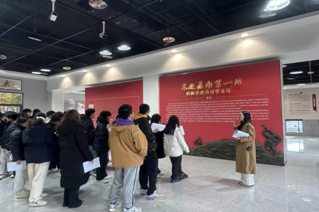 上午,同学们在教师的带领下走进校内新四军历史研学基地,开展实地参观学习。基地内丰富的展陈史料、珍贵的历史文物与生动的图文讲解,系统呈现了新四军在抗日战争中的奋斗历程与精神风貌。教师们结合展陈内容开展现场教学,围绕“信仰的力量”“人民军队的初心”等主题进行讲解,引导学生从具体的历史细节中理解革命传统的深刻内涵。同学们认真观看、仔细聆听,在近距离接触历史的过程中增强了对红色文化的认同与思考。