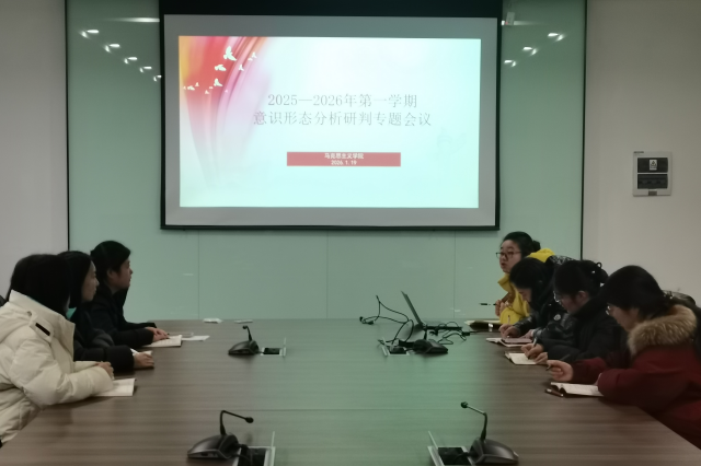 为全面总结2025年度意识形态工作成效,精准研判年末岁初意识形态领域风险隐患,切实巩固马克思主义理论在意识形态领域的指导地位,2026年1月19日,马克思主义学院党支部在210会议室召开2025年第四季度意识形态工作分析研判会、2025年度意识形态工作总结会。会议由马克思主义学院党支部副书记张玥主持、支部全体党员参加。