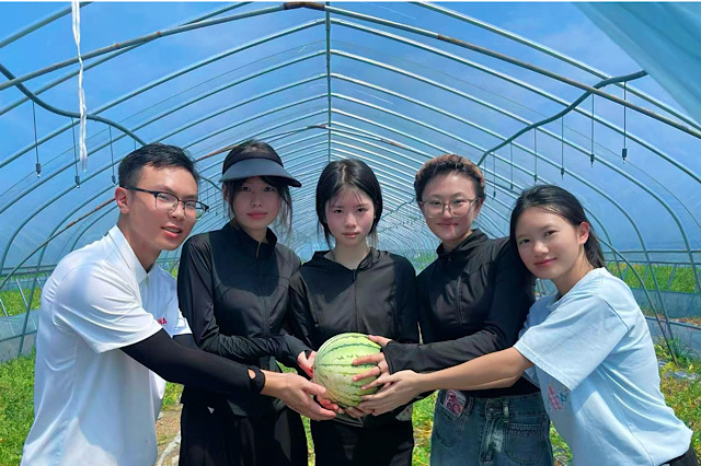 刚到农场,联溪村书记王国辉便和瓜农一同领着团队走进瓜棚。棚内虽炎热,大家却听得专注:王国辉与瓜农一边指着藤蔓上的西瓜讲解种植细节,从瓜苗养护到结果管理逐一说明,还分享了高温天给西瓜遮阳、合理浇水的护瓜技巧,让团队切实摸清了西瓜的品质由来。