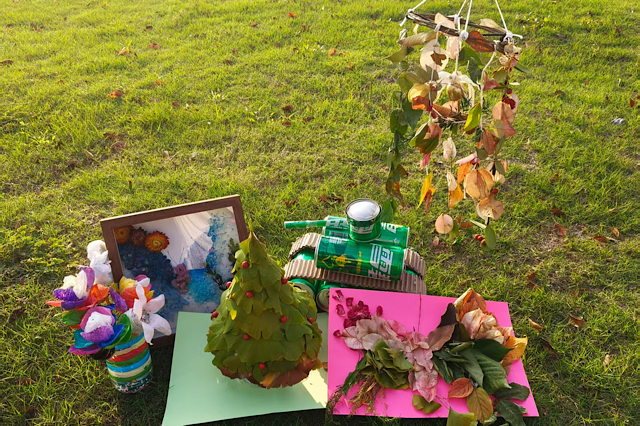 活动伊始,学生干部们化身“自然拾荒者”,在校园角落收集银杏叶、梧桐叶等落叶,回收塑料瓶、旧纸板等废弃材料。制作现场,大家分工协作:裁剪、拼接、粘贴、上色,每道工序都细致打磨。干枯的落叶经修剪拼贴成栩栩如生的秋日风景画,废弃塑料瓶缠绕丝带化作别致的装饰品和小坦克,原本的“无用之物”在巧手下焕发新生。