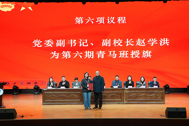 赵学洪为第六期青马班授班旗,并为班主任芮慧娟颁发聘书。