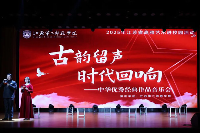 12月5日,2025年江苏省“高雅艺术进校园”系列活动“古韵留声·时代回响——中华优秀经典作品音乐会”,在南京机电职业技术学院青春剧场圆满落幕。本次音乐会由江苏第二师范学院倾情演绎,师生们现场沉浸式感受中华经典艺术魅力。