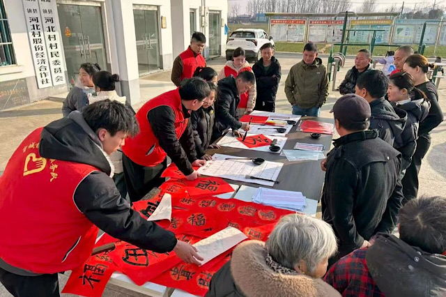 春节前夕,团队成员协同书法老师走进河北村,开展 “写春联、送祝福” 文明实践活动。活动现场笔墨飘香,大家挥毫泼墨,为村民书写饱含吉祥寓意的春联与福字,并免费上门赠送到户。一幅幅喜庆春联、一句句美好祝福,让浓浓年味浸润乡村,温暖民心,赢得村民一致好评。