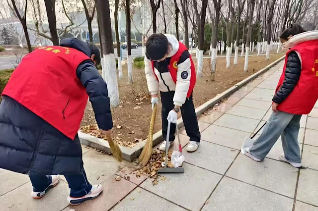 社区的干净整洁,需要有人用心守护。王晴手持扫帚,弯腰认真清扫居委会道路上的落叶,专注的模样让每一寸路面都焕发清爽;魏祥与同学们并肩作战,蹲守步道清理杂物、清扫枯枝,用双手拂去社区的“尘埃”,让家园环境愈发整洁。一帚一扫间,是对家园的热爱,更是青年的责任与担当。