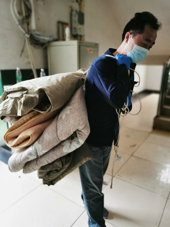 迎着清晨的暖阳,信息系的教职工们一大早来到了6栋宿舍楼,他们“全副武装”,撸起袖子,准备大干一场。老师们分为三组,每一组包干一层楼,明确分工以后,大家便开动起来,女老师们主要负责整理床铺,给被子褥子贴上标签,男老师们贡献体力,扛起被子往外晒,在大家的密切配合之下,经过两个多小时,终于完成了60个宿舍的被子晾晒。晾晒工作结束后,又开始宿舍的打扫以及全面消杀。