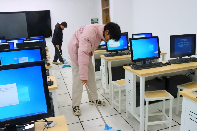活动伊始,团委副书记李含进行动员讲话,强调了雷锋精神的重要性,并呼吁同学们积极参与,以实际行动践行雷锋精神,真正做到“我为同学办实事”,同时为学院创造一个更加整洁、舒适的机房环境。随后,同学们纷纷拿起清洁工具,积极投入到机房的卫生大扫除中。他们分组合作,各司其职,对机房地面、桌椅以及机箱前后进行了全面细致的清洁。在清洁过程中,大家发扬不怕脏、不怕累的精神,认真负责地清扫每一个角落。经过一个多小时的共同努力,机房焕然一新,展现出整洁、明亮的新面貌。同学们看着自己的劳动成果,脸上洋溢出满足和自豪的笑容。