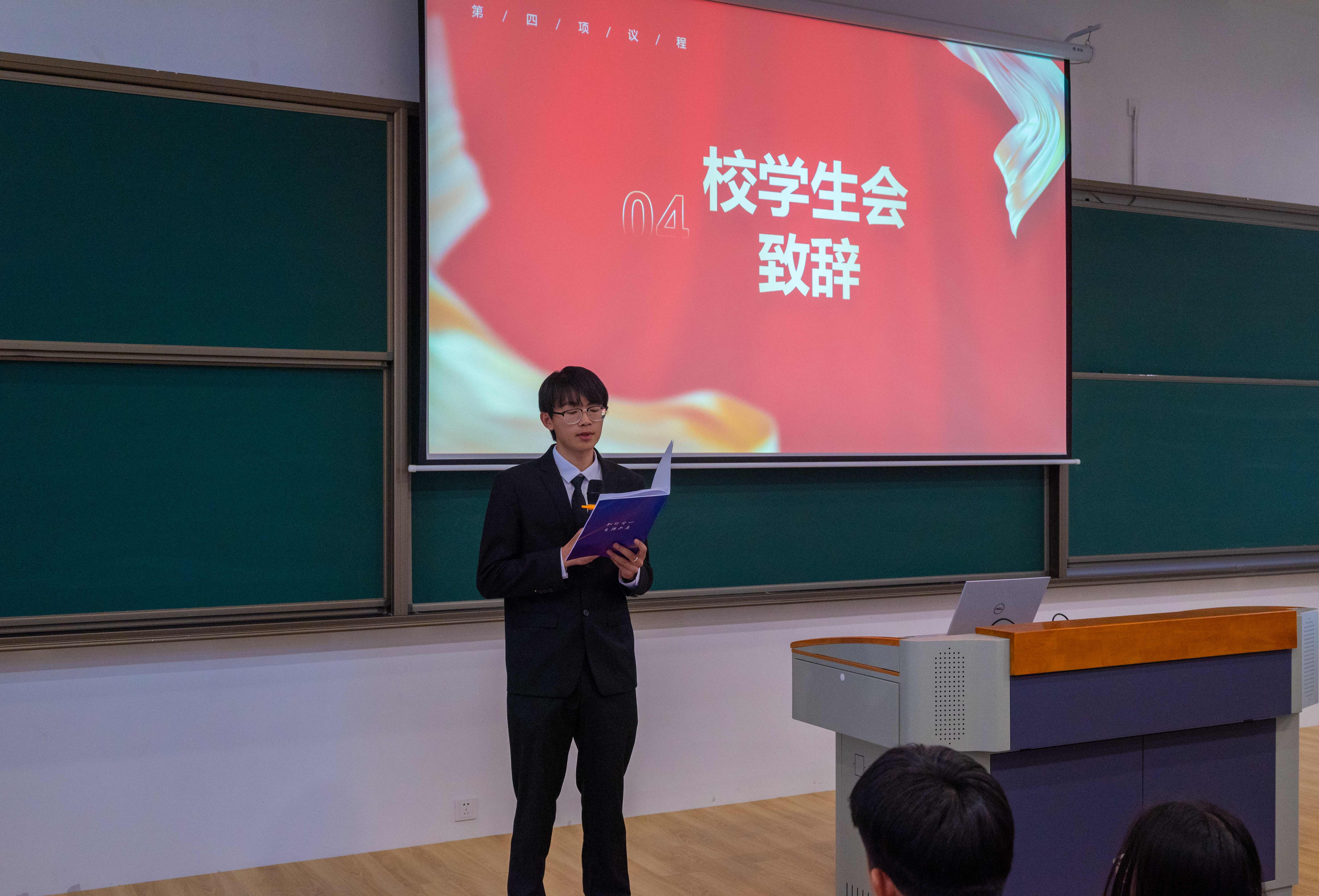 校学生会主席团代表张善意上台致辞。致辞中,他表达了对学校和系部学生会未来工作的期望,希望双方能够进一步加强交流合作,携手共进,为学生们创造更多学习、成长和锻炼的机会。