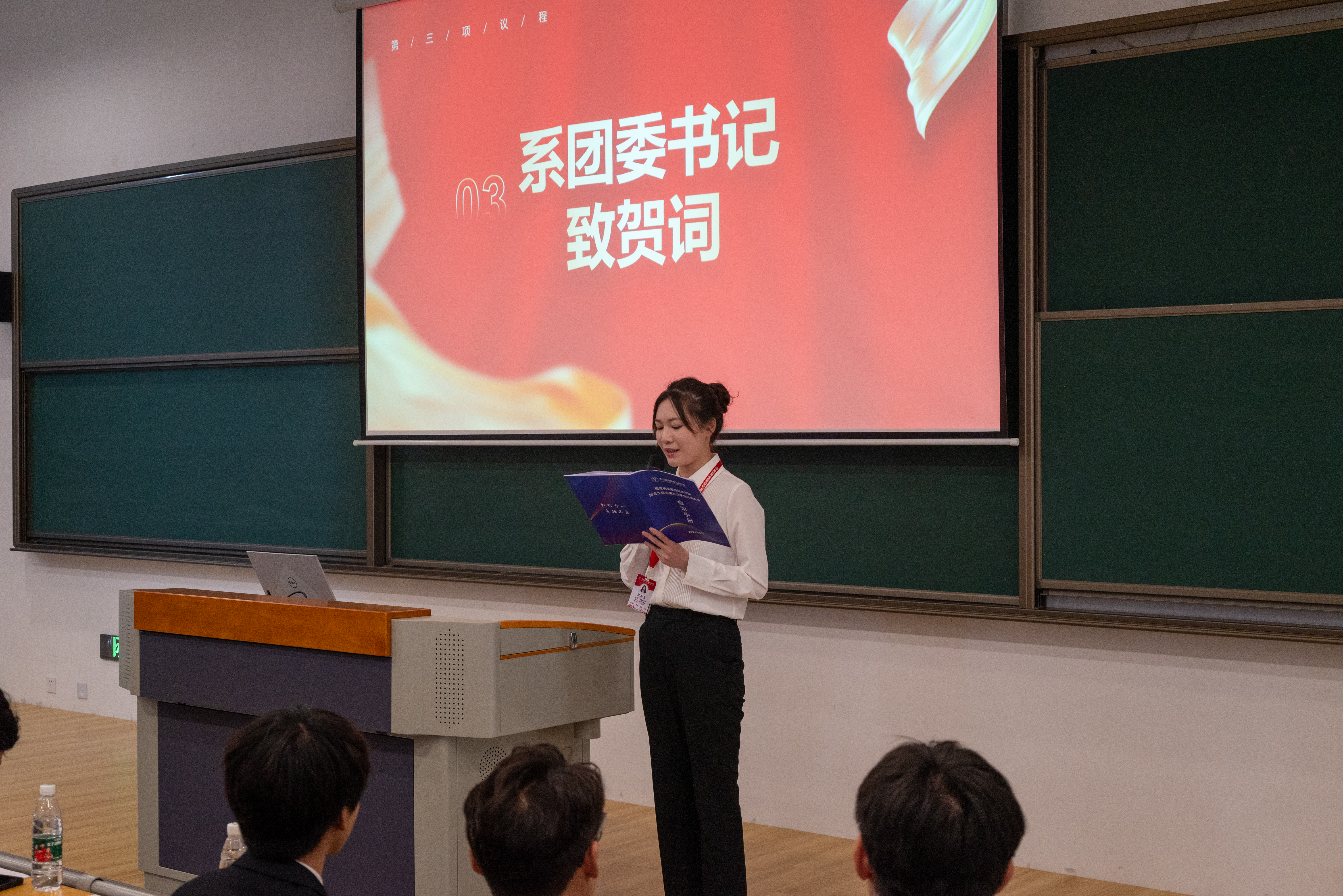 大会伊始,全体与会人员肃然起立,共同奏唱国歌。随后,系团委书记沈歆岩上台发表了热情洋溢的贺词。她首先深情回顾了信息工程系学生会过去一年的辛勤付出和取得的显著成绩,对大家的努力和奉献给予了高度评价。同时,她也对新一届学生会委员寄予了殷切的期望和美好的祝愿,希望他们能够继续发扬优良传统,勇攀新高峰,为系部的发展贡献更多的力量。