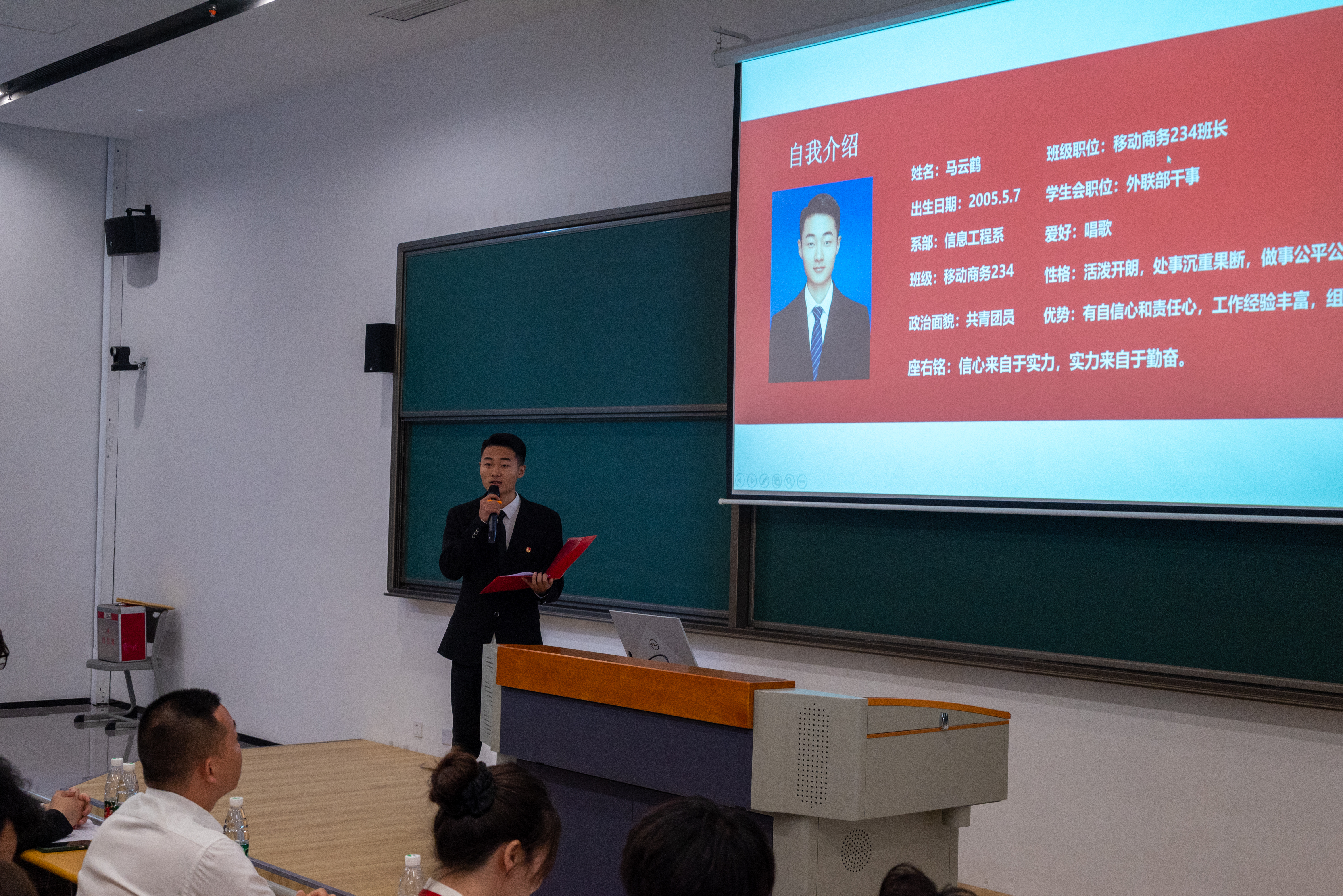 随后,信息工程系第十五届学生会副主席丁明杰作信息工程系学生工作报告。报告总结了过去一年里信息工程系学生会在思想引领、组织建设、创新发展、文化体育、社会实践等方面所取得的显著成绩。同时,还提到不足和改进之处,包括加强活动宣传、提高活动质量、加强与同学们的沟通等。