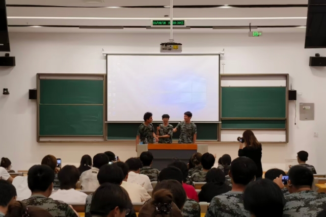为保障军训节奏不中断、训练热情不减退,教官们结合实际灵活调整方案,晚训期间,组织信息工程系全体新生在勤学楼教室开展 “唱响军歌” 主题活动,用嘹亮歌声为军训增添别样色彩。